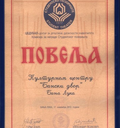 Поводом окончања 36. сезоне Бањалучко студентско позориште је у Дому омладине 03. децембра 2012. године додијелило годишњу Златну повељу ЈУ "Бански двор - Културни центар" Бања Лука.