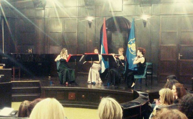 Бански двор Културни центар: Публика уживала у концерту Флаутета 24.11.2016 15:01 | А. М. Бањалука - Кроз звук флауте бањалучки квартет "Флаутете" у Банском двору Културном центру оживио је композиције Вивалдија, Дебисија, Рајха и Рожмана. Публика је истински уживала у таленту Марије Пилиповић, Наташе Вукојевић, Сунчице Лончар…