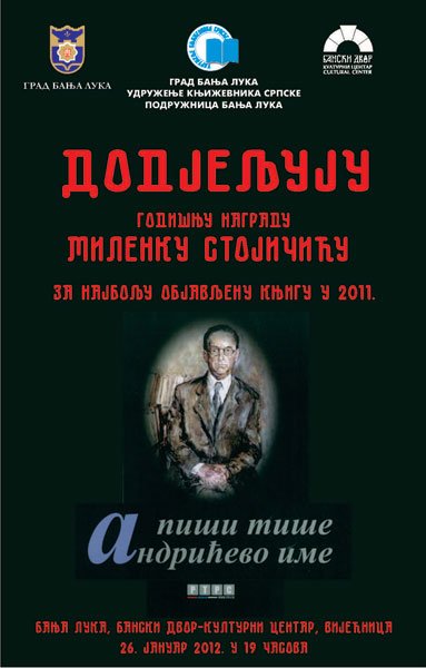 У Вијећнци Банског двора 26.01.2012.године у 19,00 часова биће додјијељена награда Миленку Стојичићу за најбољу објављену књигу у 2011. години.