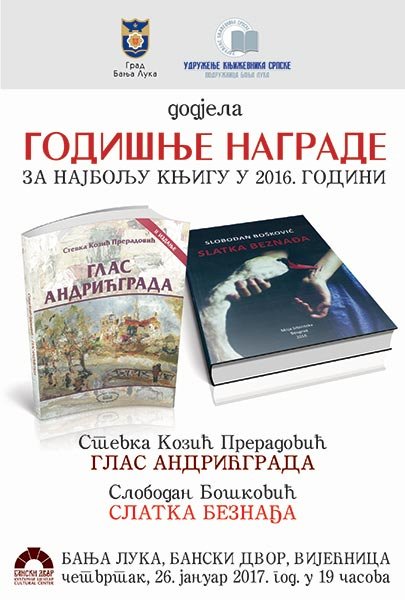 НАГРАДА ЗА КЊИГУ ГОДИНЕ 2016. УДРУЖЕЊА КЊИЖЕВНИКА РС – ПОДРУЖНИЦА БАЊАЛУКА И ГРАДА БАЊАЛУКА