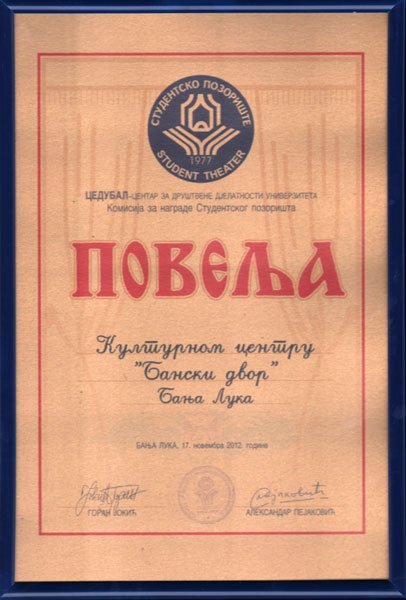 ЗЛАТНА ПОВЕЉА БАНСКОМ ДВОРУ АРХИВА, ОБАВЈЕШТЕЊА16/12/2012 Поводом окончања 36. сезоне Бањалучко студентско позориште је у Дому омладине 03. децембра 2012. године додијелило годишњу Златну повељу ЈУ „Бански двор – Културни центар“ Бања Лука.