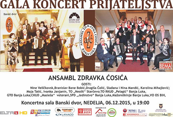 У Концертној дворани Банског двора 06. децембра 2015. године (недјеља) у 19,00 часова одржаће се „Гала концерт пријатељства“ Ансамбла Здравка Ћосића поводом јубилеја 5 година обновљеног рада, 35 година постојања Ансамбла, 45 година умјетничког рада и 35 година композиторског рада Здравка Ћосића,