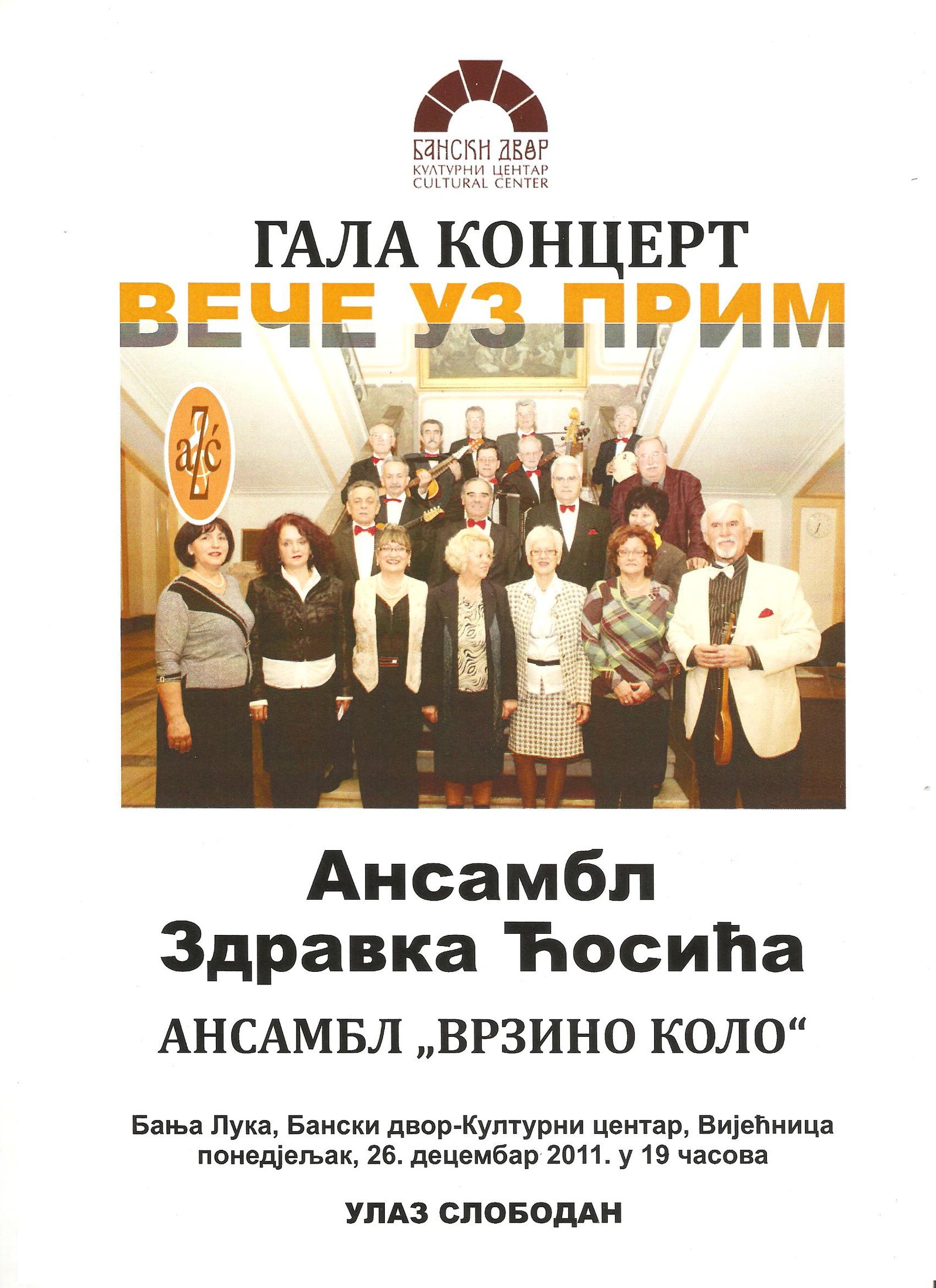 Гала концерт Вече уз прим АРХИВА14/12/2011 У Вијећници Банског двора дана 26.12.2011.године у 19,00 часова одржаће се Новогодишњи гала концерт ансамбла Здравка Ћосића.