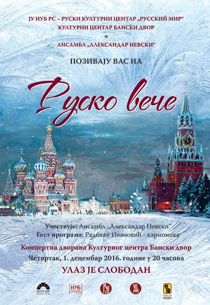 У Концертној дворани Банског двора 01. децембра 2016. године (четвртак) у 20,00 часова одржаће се годишњи концерт Ансамбла „Александар Невски“,