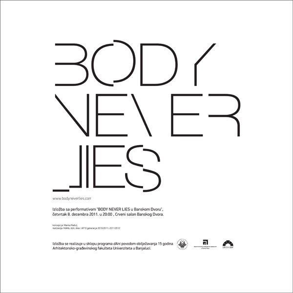 Изложба „Body never lies“ Архитектонско – грађевинског факултета у Бања Луци АРХИВА07/12/2011 У Црвеном салону Банског двора дана 08.12.2011.године у 20,00 часова отвориће се изложба „Body never lies“ Архитектонско – грађевинског факултета У Бања Луци