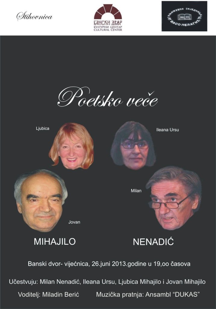 У Вијећници Банског двора 26. јуна 2013. године (сриједа) у 19,00 часова одржаће се књижевно-поетско вече пјесника из Петроварадина (Нови Сад), Милан Ненадић, Илеане Урса-Ненадић, Јован Михајло и Љубица Вуков-Михајло, у сарадњи са Књижевном заједницом Васо Пелагић ( Бања Лука).