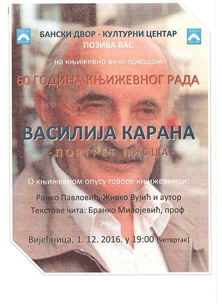 У Вијећници Банског двора 01. децембра 2016. године (четвртак) у 19,00 часова одржаће се књижевно вече – Шездесет година књижевног рада – Портрет Василија Карана,