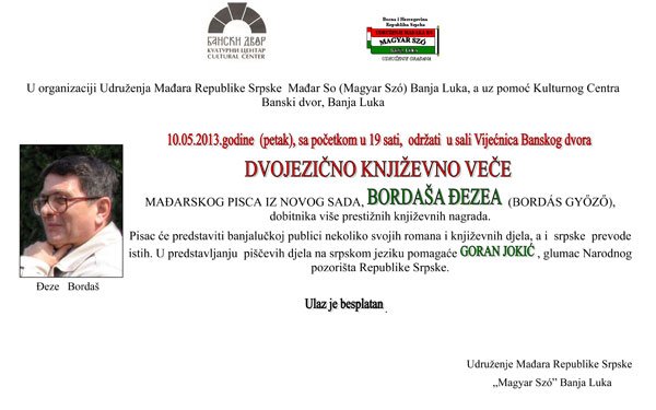 У Вијећници Банског двора 10. маја 2013. године (петак) у 19,00 часова одржаће се књижевно вече са Бордашом Ђезеом у сарадњи са Удружењем Мађара Републике Српске.