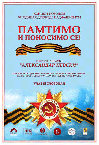 У Концертној дворани Банског двора 09. маја 2015. године (субота) у 20,00 часова, одржаће се концерт – Ансамбл „Александар Невски“ Бања Лука,