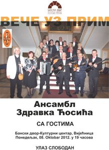Концерт Ансамбла Здравка Ћосића са гостима – Вече уз прим АРХИВА14/09/2012 У Вијећници Банског двора 08. октобра 2012. године (понедјељак) у 19,00 часова одржаће се концерт Ансамбла Здравка Ћосића са гостима – Вече уз прим.