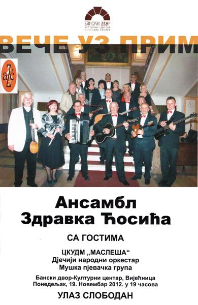 У Вијећници Банског двора 19. новембра 2012. године (понедјељак) у 19,00 часова одржаће се концерт Ансамбла Здравка Ћосића „Вече уз прим“.