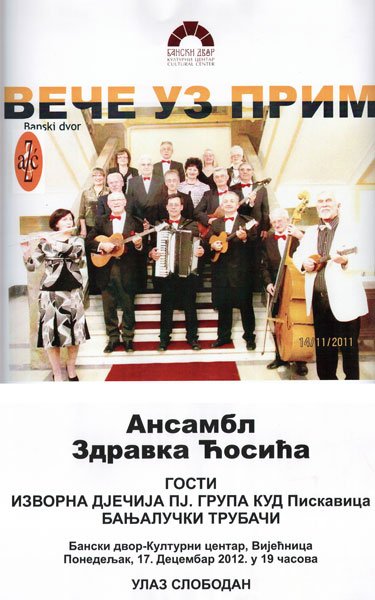 Концерт Ансамбла Здравка Ћосића „Вече уз прим“ са гостима АРХИВА01/12/2012 У Вијећници Банског двора 17. децембра 2012. године (понедјељак) у 19,00 часова одржаће се концерт Ансамбла Здравка Ћосића „Вече уз прим“ са гостима. Гости: Изворна дјечија пјевачка група КУД Пискавица и Бањалучки трубачи