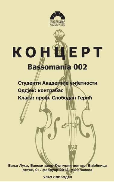 У Вијећници Банског двора 01. фебруара 2013. године (петак) у 20,00 часова одржаће се концерт „Bassomania 002“ у извођењу студената Академије умјетности Бања Лука са одсјека за контрабас а у класи Слободана Герића.