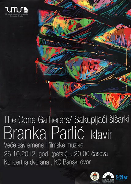 У Концертној дворани Банског двора 26. октобра 2012. године (петак) у 20,00 часова одржаће се концерт Бранке Парлић – клавир (концерт The Cone Gatherers/ Skupljači šišarki). Вече савремене и филмске музике.