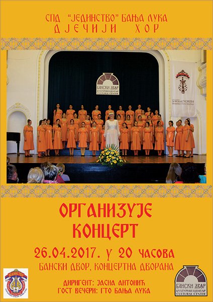 У Концертној дворани Банског двора 26. априла 2017. године (сриједа) у 20,00 часова одржаће се концерт – Дјечији хор СПД „Јединство“.