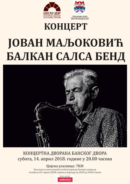 У организацији Банског двора – Културног центра 14. априла 2018. године (субота) у Концертној дворани у 20.00 часова одржаће се концерт – ЈОВАН МАЉОКОВИЋ БАЛКАН САЛСА БЕНД.