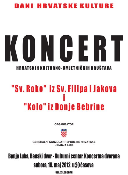 У Концертној дворани Банског двора 19.05.2012. године у 20,00 часова у оквиру Дана хрватске културе, одржаће се концерт хватских културно-умјетничких друштава „Св. Роко“ из Св. Филипа и Јакова и „Коло“ из Доње Бебрине у организацији Генералног конзулата Републике Хрватске у Бањој Луци.