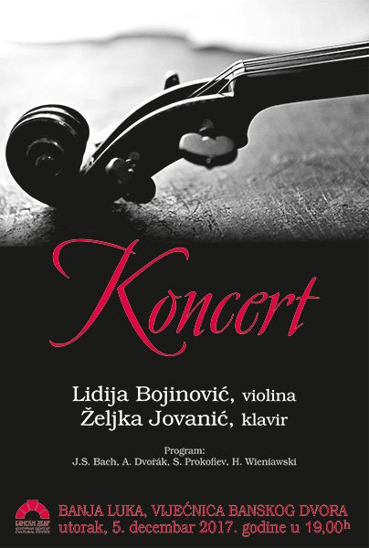 У Вијећници Банског двора 05. децембра 2017. године (уторак) у 19.00 часова одржаће се концерт Лидија Бојиновић, виолина и Жељка Јованић, клавир.