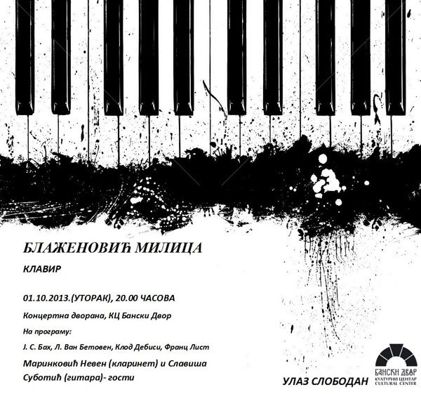 У Концертној дворани Банског двора 01. октобра 2013. године у 20,00 часова одржаће се концерт Милице Блаженовић, клавир, студенткиње IV године Музичке академије