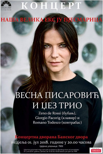 У Концертној дворани Банског двора 01. јула 2018. године (недјеља) у 20.00 часова одржаће се концерт НАША ВЕЛИКА ЕX YУ ПЈЕСМАРИЦА – ВЕСНА ПИСАРОВИЋ & ЏЕЗ ТРИО, Zeno de Rossi (бубањ), Giorgio Pacorig (клавир) i Romano Todesco (контрабас).