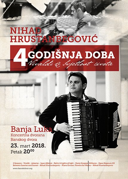 У Концертној дворани Банског двора 23. марта 2018. године (петак) у 20.00 часова одржаће се концерт маестра Нихада Хрустанбеговића под називом „4 годишња доба“ (Вивалди) & Свјетлост живота (Класична хармоника и клавир соло).