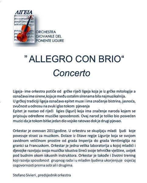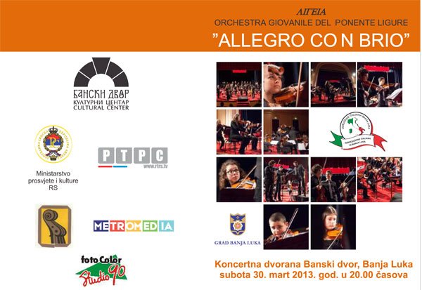 plakat-1У Концертној дворани Банског двора 30. марта 2013. године (субота) у 20,00 часова одржаће се концерт под називом „Омладински оркестар Источне Лигурије“ из Сан Рема.