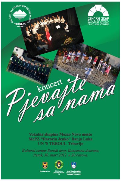 Концерт „Пјевајте са нама“ АРХИВА14/03/2012 У Концертној дворани Банског двора дана 30.03.2012.године у 20,00 часова, одржаће се концерт „Пјевајте са нама“ вокална скупина Меззо Ново место МеПЗ „Даворин Јенко“ Бања Лука, УН `С ТРБОУЛ Трбовље.