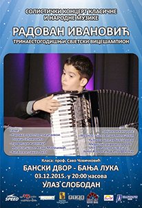 У Концертној дворани Банског двора 03. децембра 2015. године (четвртак) у 20,00 часова, одржаће се концерт – Радован Ивановић, хармоника, ученик шестог разреда Ниже музичке школе „Владо Милошевић“.