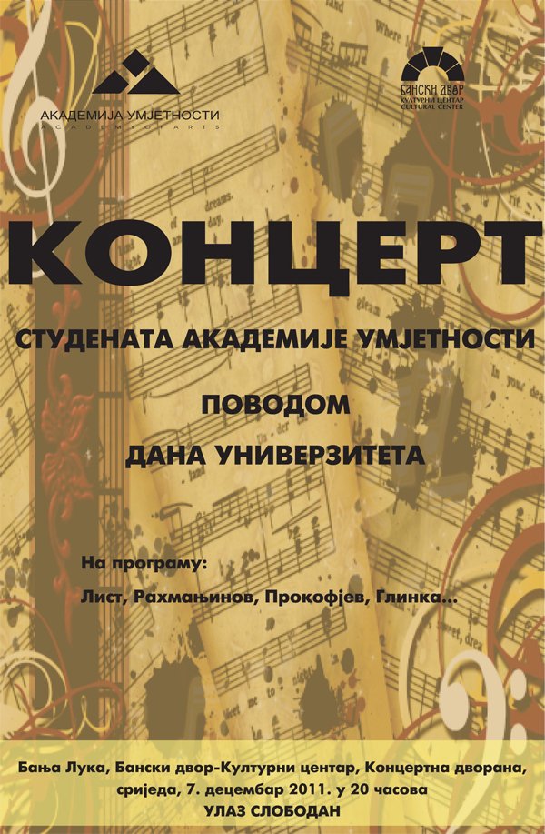 У Концертној дворани Банског двора дана 07.12.2011.године у 20,00 часова одржаће се концерт студената академије умјетности поводом дана универзитета. ПРОГРАМ: 1. С. Рахмањинов: Прелид ха – мол оп.32 бр.10 Соња Бобрек – клавир, III година Класа: мр Невена Поповић, ред. проф.