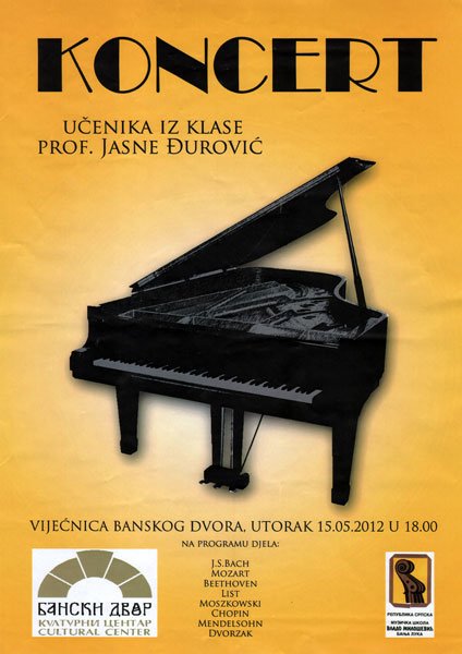 Концерт ученика Музичке школе „Владо Милошевић“ АРХИВА03/05/2012 У Вијећници Банског двора 15.05.2012. године у 18,00 часова одржаће се концерт ученика Музичке школе „Владо Милошевић“. Класа: Јасна Ђуровић Одсјек: клавир ПРОГРАМ: J.S.Bach Mozart Beethoven List Moszkowski Chopin Mendelsohn Dvorzak