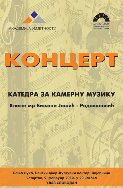 У Вијећници Банског двора 09.02.2012.године у 20,00 часова одржаће се концерт студената Академије умјетности катедра за камерну музику класа: мр Биљана Јашић-Радовановић,