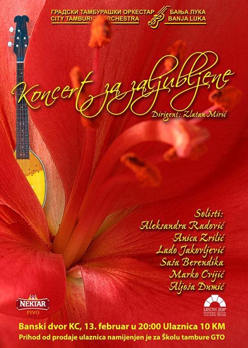 У Концертној дворани Банског двора 13. фебруара 2017. године (понедељак) у 20,00 часова одржаће се концерт за заљубљене Градски тамбурашки оркестар Бања Лука.