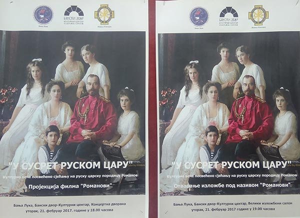 Бански двор – Културни центар (Бања Лука, Република Српска), заједно са Администрацијом Града Бања Лука, Бањолучком епархијом Српске православне цркве, Императорским православним палестинским друштвом Русије и градом Нижњи Новгород , у простору Банског двора -Културног центра организује културно вече под називом “У сусрет рускоме цару“. Вече је посвећено сјећању на светог мученика Николаја II и руску царску породицу Романов. Вече се састоји од презентације архивских докумената и фотоматеријала, те изложбе фотографија царске породице. На тај начин биће представљене активности и живот посљедњег руског владара као и његов велики допринос у заштити православних Срба.