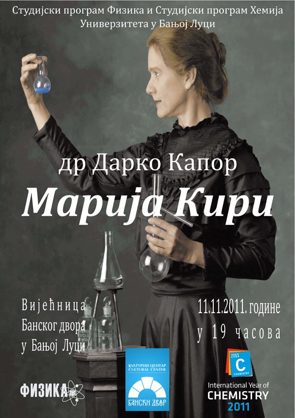 У Вијећници Банског двора 11.11.2011.године у 19,00 часова одржаће се предавање под насловом “ Мадам Цурие“Текућа година (2011) је проглашена међународном годином хемије од стране Уједињених Нација (УН).Ова година је изабрана поводом стоте годишњице Нобелове награде за хемију која је 1911. додјељена Марији Кири, једној од најпознатијих истраживача у области хемије и физике.
