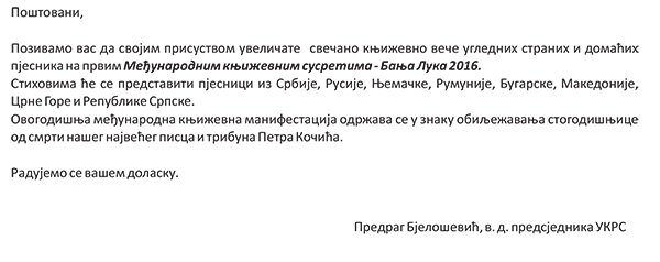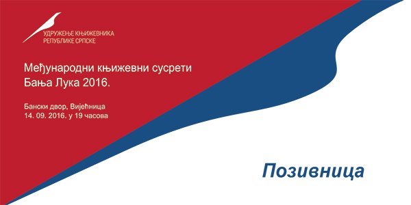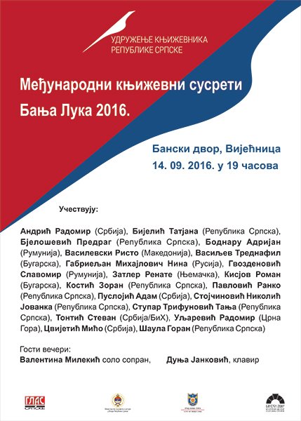 Међународни књижевни сусрети Бања Лука 2016. АРХИВА24/12/2015 У Вијећници Банског двора 14. септембра 2016. године (сриједа) у 19,00 часова одржаће се Међународни књижевни сусрети Бања Лука 2016.