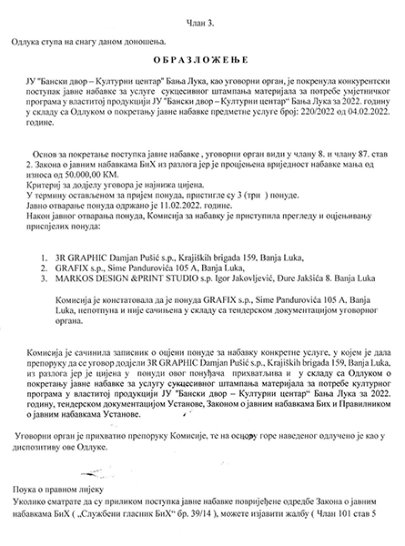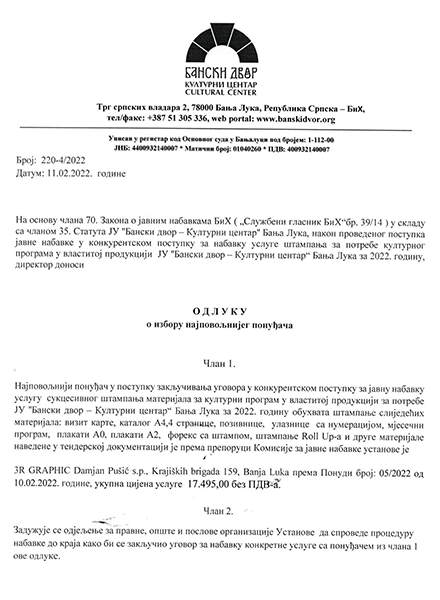 Одлука о избору најповољнијег понуђача ЈАВНЕ НАБАВКЕ11/02/2022 Одлука о избору најповољнијег понуђача у поступку закључивања уговора у конкурентском поступку за јавну набавку услугу сукцесивног штампања материјала за културни програм у властитој продукцији за потребе ЈУ „Бански двор – Културни центар“.