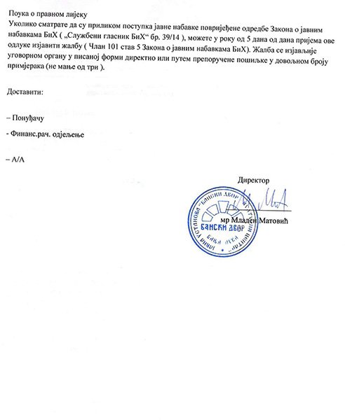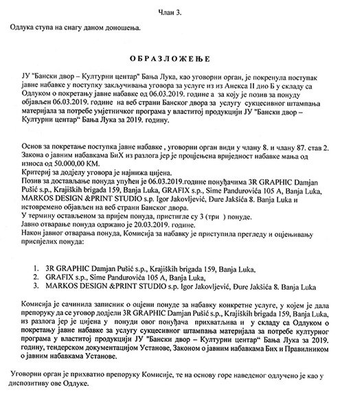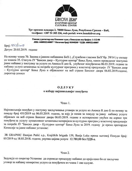 Одлука о избору најповољнијег понуђача за услугу сукцесивног штампања материјала за културни програм у властитој продукцији за потребе ЈУ „Бански двор – Културни центар“ за 2019. годину
