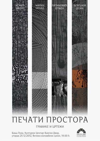 Отварање изложбе цртежа и графика четири млада умјетника АРХИВА04/12/2012 У Великом изложбеном салону Банског двора 25. децембра 2012. године (уторак) са почетком у 19,00 часова одржаће се отварање изложбе цртежа и графика четири млада умјетника (Марио Игњић, Ненад Марин, Огњен Латиновић и Дејан Ћебеџија).