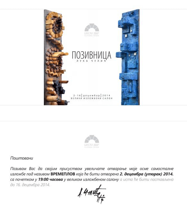 У Великом изложбеном салону 02. децембра 2014. године (уторак) у 19,00 часова биће одржано отварање изложбе слика и скулптура под називом “Времеплов“, аутора Луке Чулића.