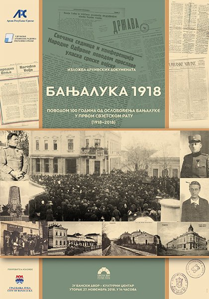 У Салону бана Светислава Тисе Милосављевића 27. новембра 2018. године (уторак) у 14.00 часова поводом 100 година од ослобођења Бањалуке у Првом свјетском рату, и 27. новембра, Дана уједињења Бањалуке са Краљевином Србијом биће отворена изложба архивских докумената „Бањалука 1918“.