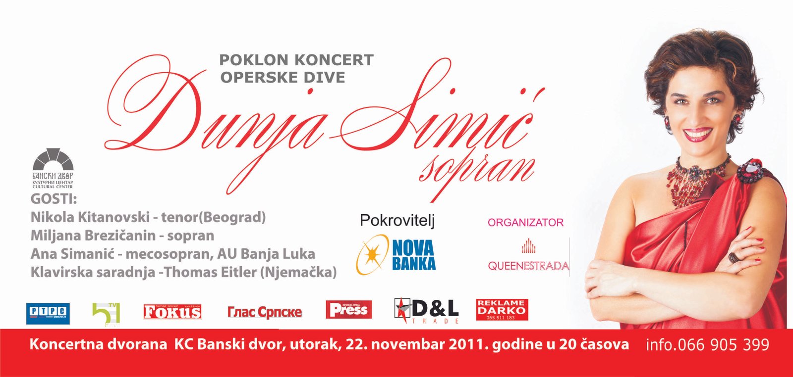 У Концертној дворани Банског двора 22.11.2011.године у 20,00 часова, одржаће се поклон концерт оперске диве Дуње Симић.