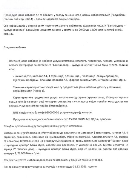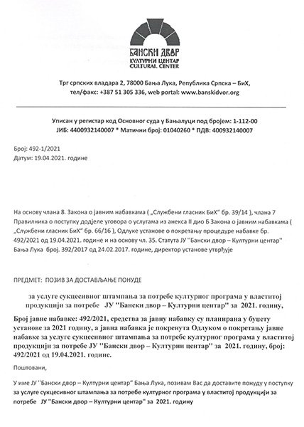 Позив за достављање понуде у поступку јавне набавке за услуге сукцесивног штампања за потребе културног програма у властитој продукцији за потребе ЈУ „Бански двор – Културни центар“ за 2021. годину
