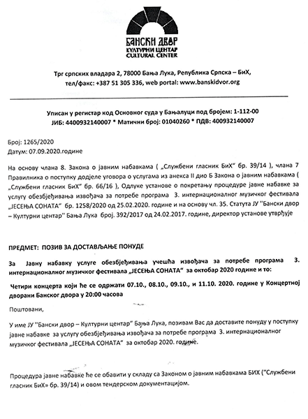 Позив за достављање понуде за набавку услуге обезбјеђивања учешћа извођача за потребе 3. интернационалног музичког фестивала „Јесења соната“ за потребе ЈУ „Бански двор – Културни центар“ за октобар 2020. године ЈАВНЕ НАБАВКЕ07/09/2020 ЛИНК ЗА ПРЕУЗИМАЊЕ – ОБРАЗАЦ ЗА ПОНУДУ ↓ Анекс јесења сонатаПреузми