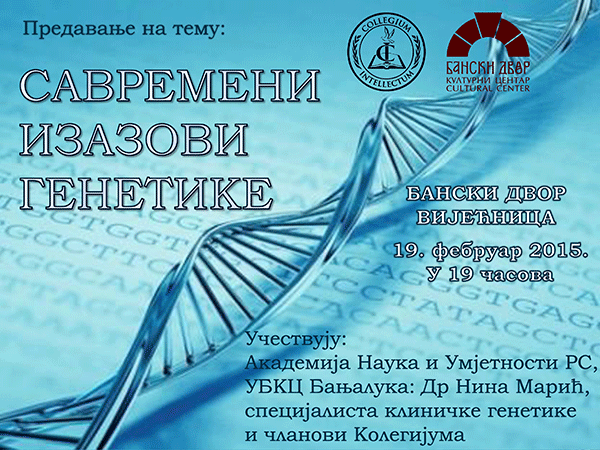 У Вијећници Банског двора 19. фебруара 2015. године (четвртак) биће одржано предавање на тему „Савремени изазови генетике“ у сарадњи са