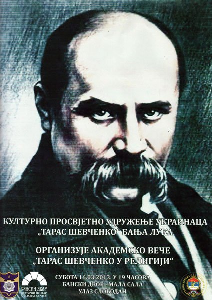 У Вијећници Банског двора 16. марта 2013. године (субота) у 19,00 часова одржаће се представа „Тарас Шевченко у религији“ поводом обиљежавања Дана Тараса Г. Шевченка у организацији Културно просвјетног удружења Украјинаца „Тарас Шевченко“ Бања Лука.