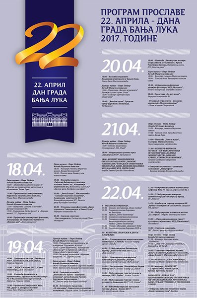 Програм прославе 22. априла – дана Града Бања Лука 2017. године АРХИВА16/01/2016 Програм прославе 22. априла – дана Града Бања Лука 2017. године. Програм
