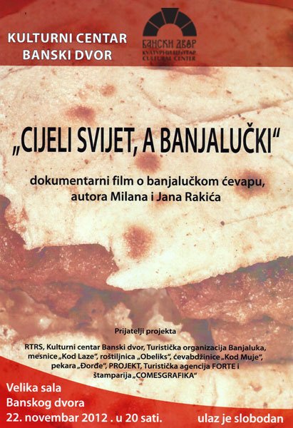 У Концертној дворани Банског двора 22. новембра 2012. године (четвртак) у 20,00 часова одржаће се промоција документарног филма о „Бањалучком ћевапу“ – назив „ЦИЈЕЛИ СВИЈЕТ, А БАЊАЛУЧКИ“ аутора Милана и Јана Ракића.