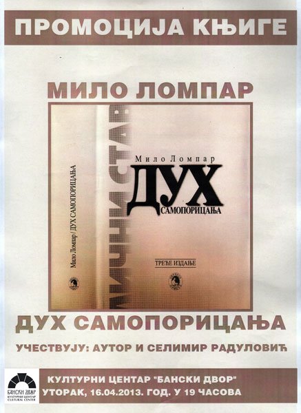 У Вијећници Банског двора 16. априла 2013. године (уторак) у 19,00 часова одржаће се промоција књиге „Дух самопорицања“ – аутор Мило Ломпар.