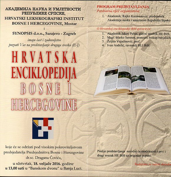 У Вијећници Банског двора 18. фебруара 2016. године (четвртак) у 13,00 часова биће промовисана књига „Енциклопедија хрватског народа у Босни и Херцеговини“,