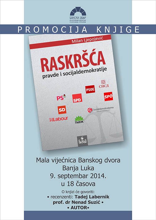 У Вијећници Банског двора 09. септембра 2014. године (уторак) у 18,00 часова одржаће се промоција књиге „Раскршћа правде и социјал-демократије“, аутора Милана Љепојевића,